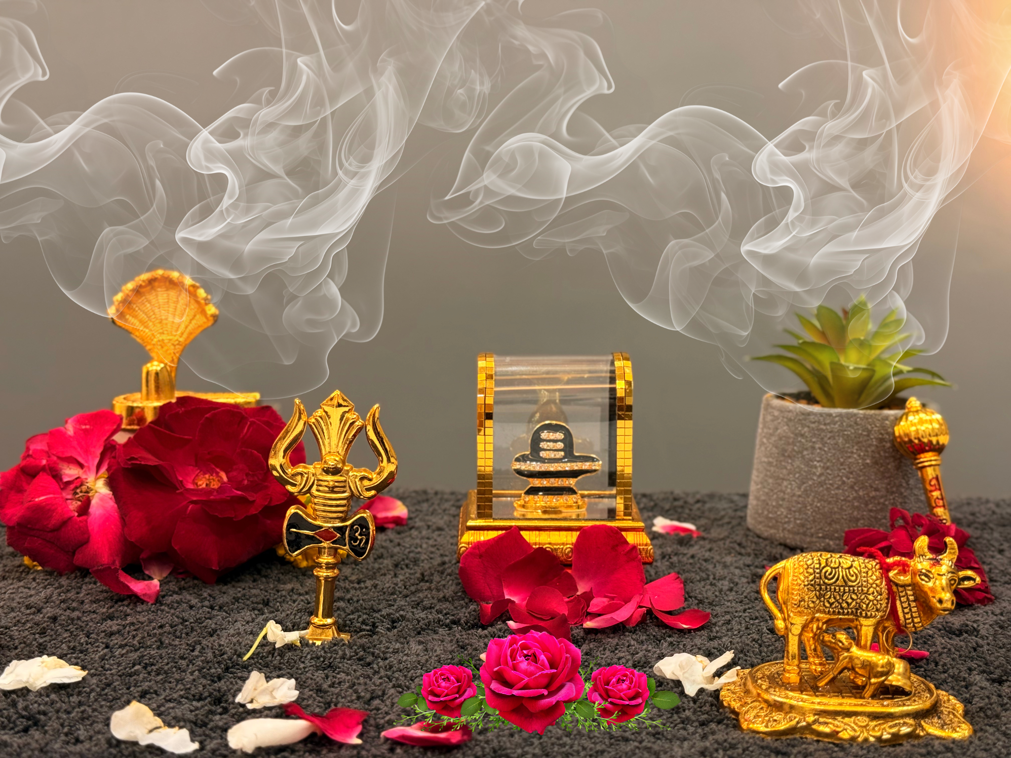 Divine Golden Shivling with Crystal Case – Spiritual Shivling Idol for Puja, Temple & Home Decor